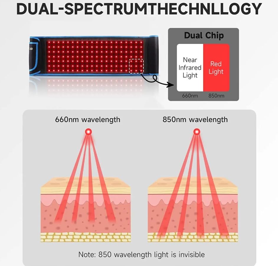 Answer 1: The therapy belt utilizes dual wavelength technology that employs 660nm red light and 850nm near-infrared light. These wavelengths penetrate deep into muscle tissues to stimulate healing, reduce inflammation, and alleviate pain, making it effective for various issues like muscle soreness, stiffness, and joint discomfort.